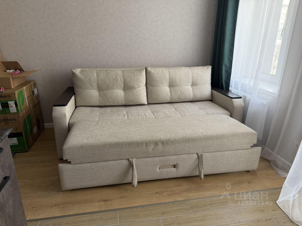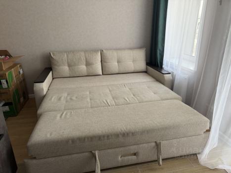 В кухне гостиной имеется большой раскладной диван. В спальне двуспальная кровать и прикроватная тумба.