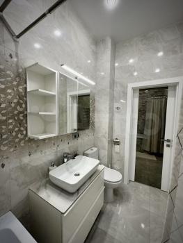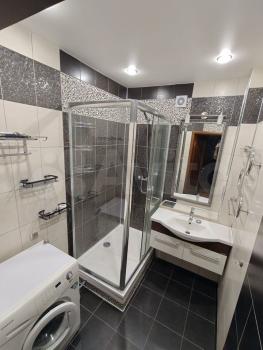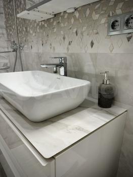 Просторный совмещенный сан. узел отделан кафельной плиткой, имеется стиральная машинка автомат, навесной шкаф с полкой и тумба под раковину. На случай отключения горячей воды установлен водонагреватель.