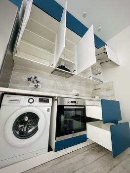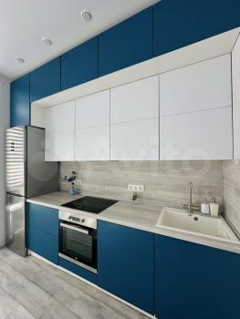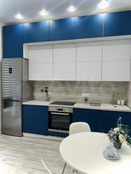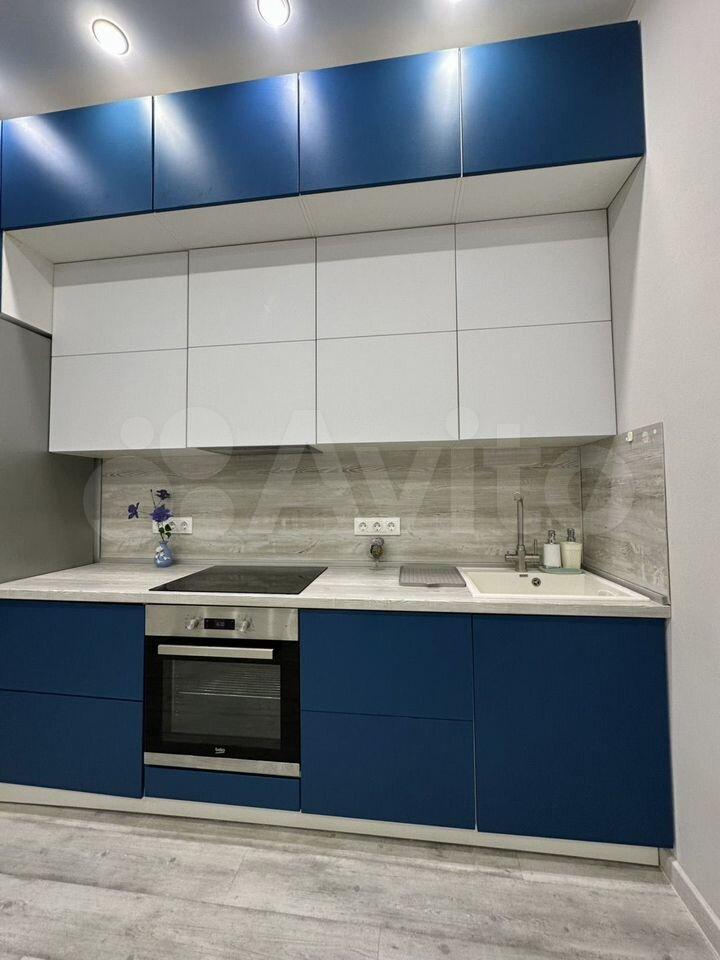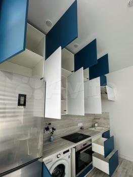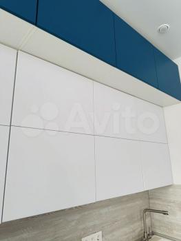 ✅бело-синяя премиум встроенная очень вместительная кухня-до потолка с пуш-ап открывающимися дверьми и фурнитурой Вlum, с матовыми софт-тач фасадами.