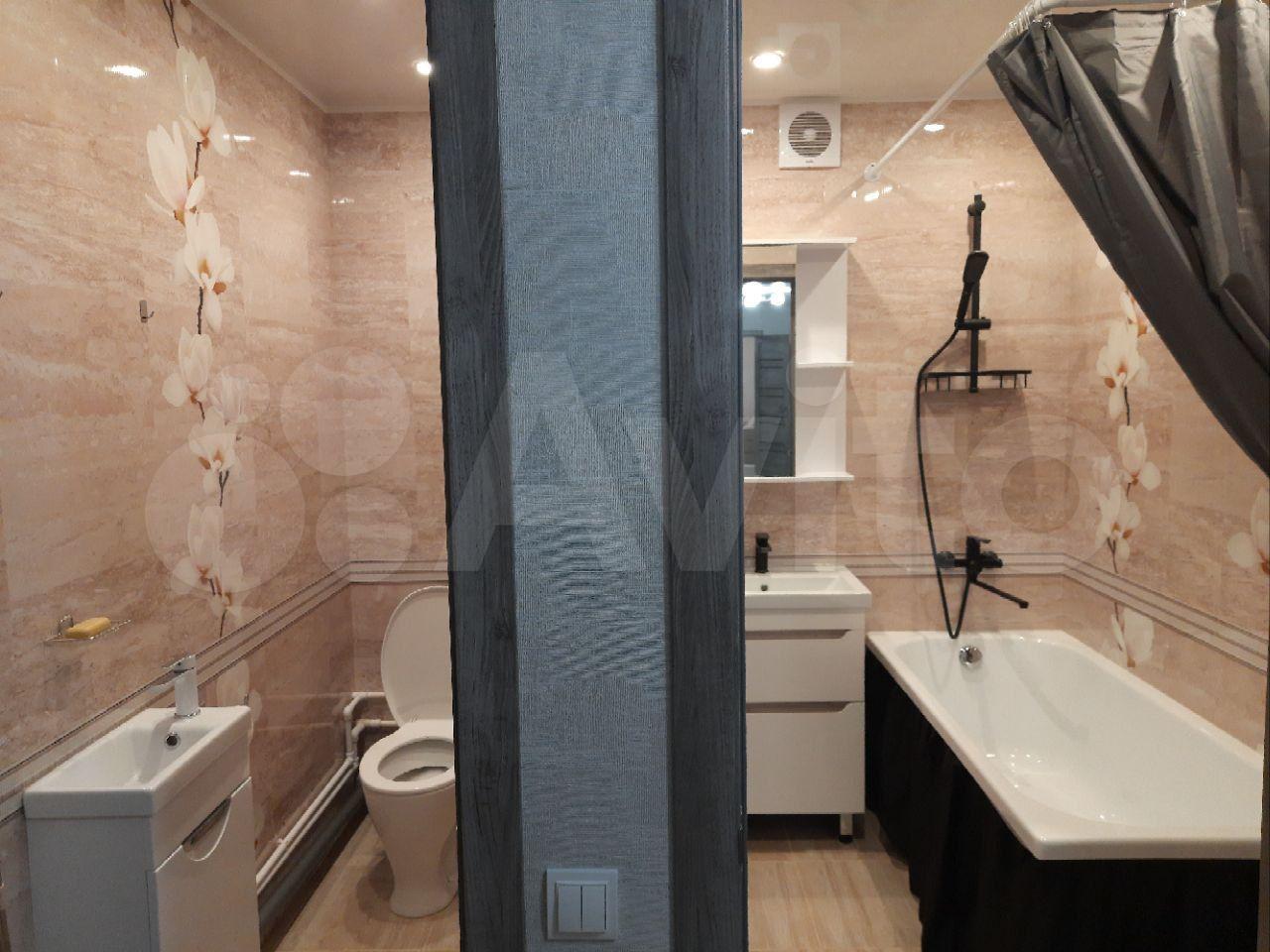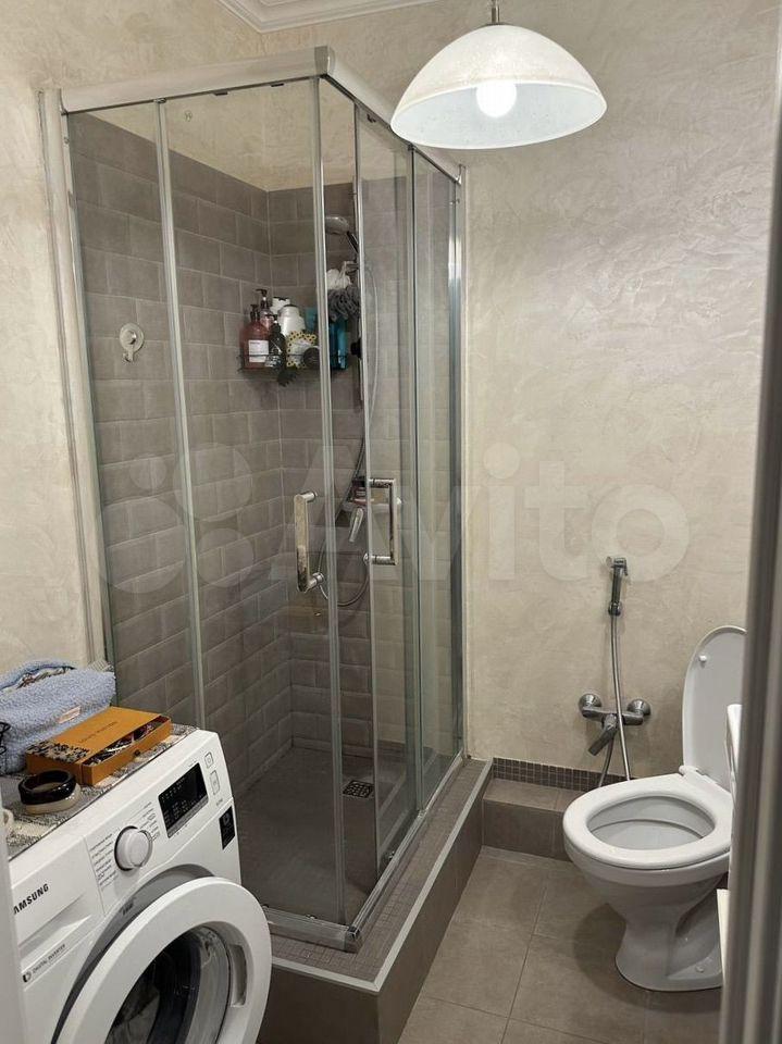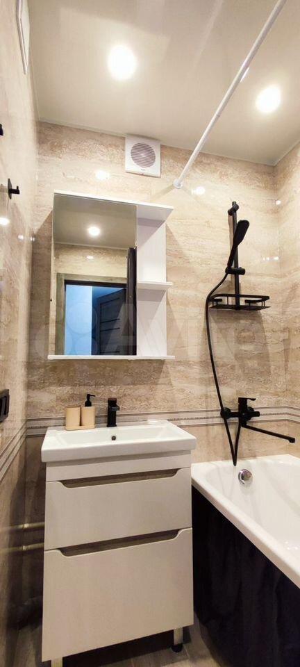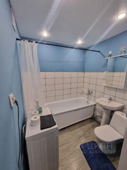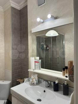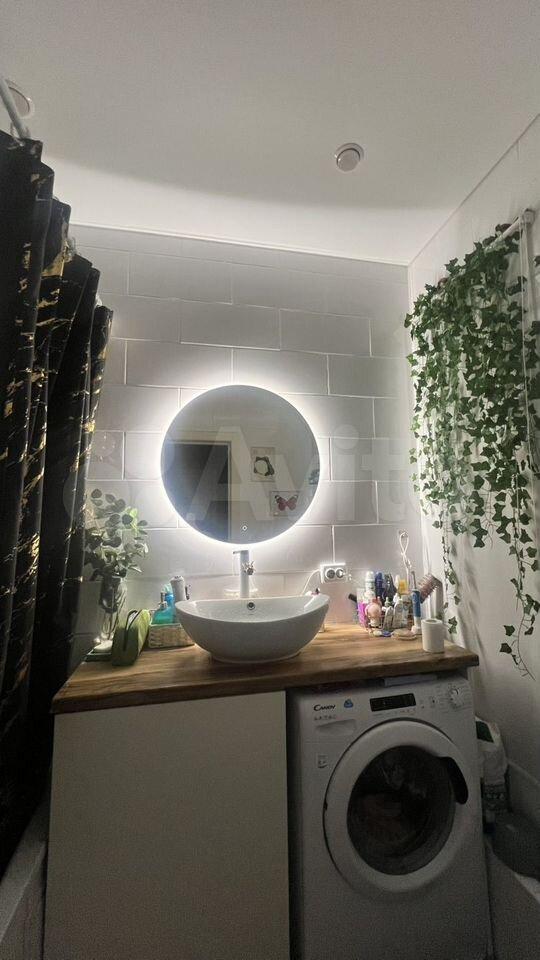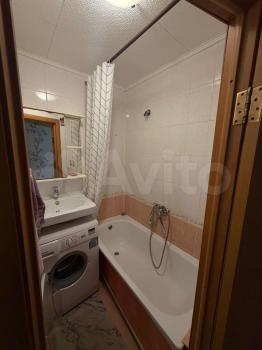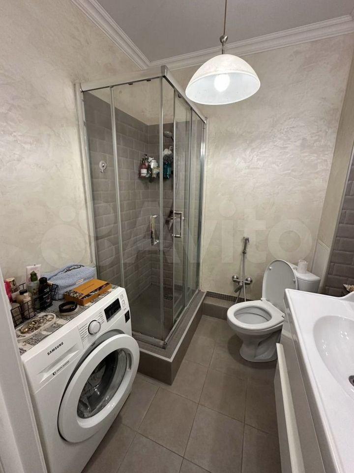 Санузел совмещенный, оформлен в современном стиле, имеется стиральная машина. Из окон открывается вид на двор с детской площадкой и открытой парковкой.