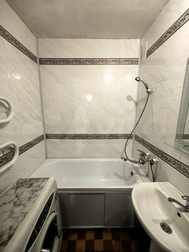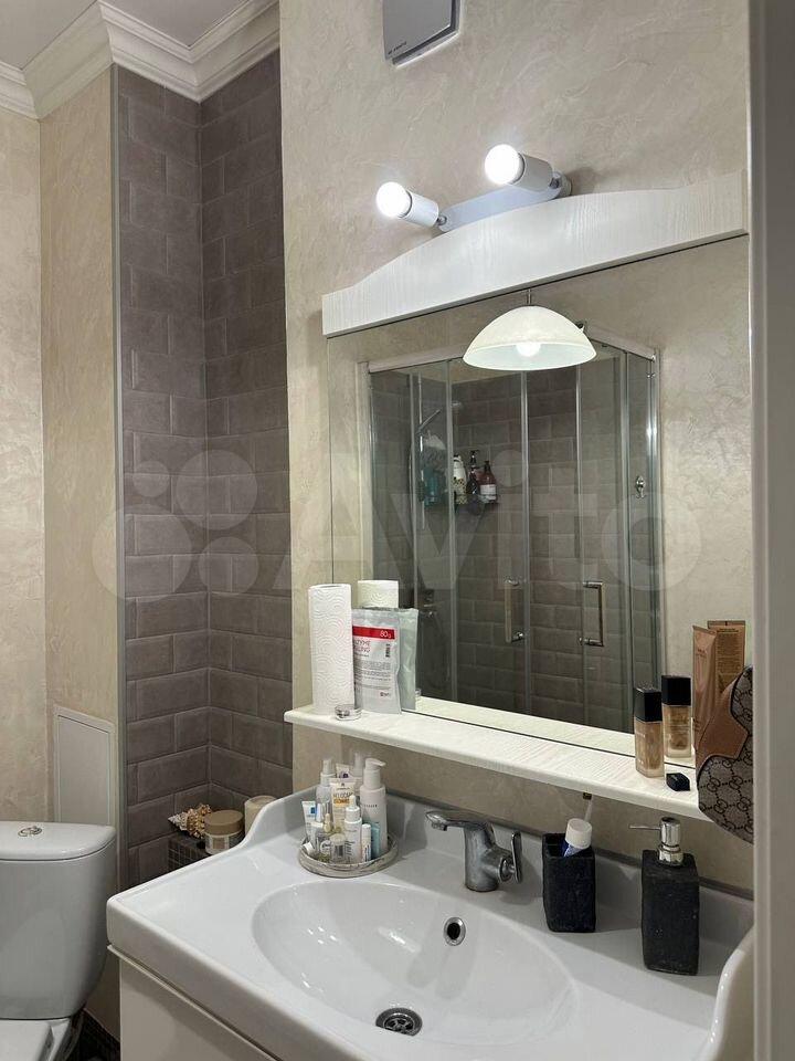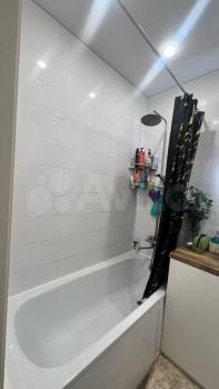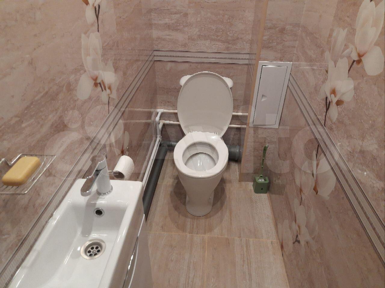 Санузел совмещенный, оформлен в современном стиле, имеется стиральная машина. Из окон открывается вид на двор с детской площадкой и открытой парковкой.