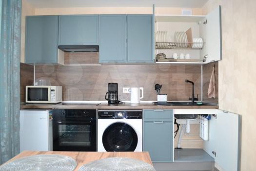 Кухня компактная, но функциональная, оснащена холодильником и газовой плитой. Из окон открывается приятный вид на зеленый двор. В ванной комнате установлена современная душевая кабина и стиральная машина.