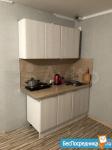 Есть кухонный гарнитур, электрическая плита, шкаф, стол, стулья, кровать, чайник, посуда.