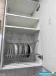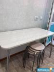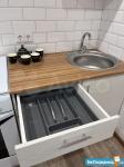 Кухня: стол, стулья (4 шт), посуда, холодильник, вытяжка, микроволновая печь, эклектическая духовка, ящики оснащены лотком для приборов, посуды; кухонный гарнитур с высокими шкафами, что позволит грамотно сформировать пространство для хранения