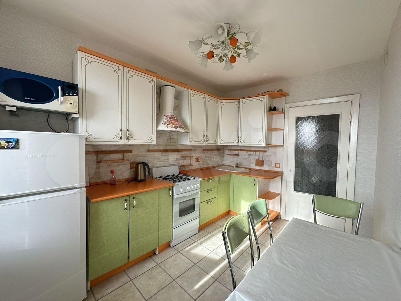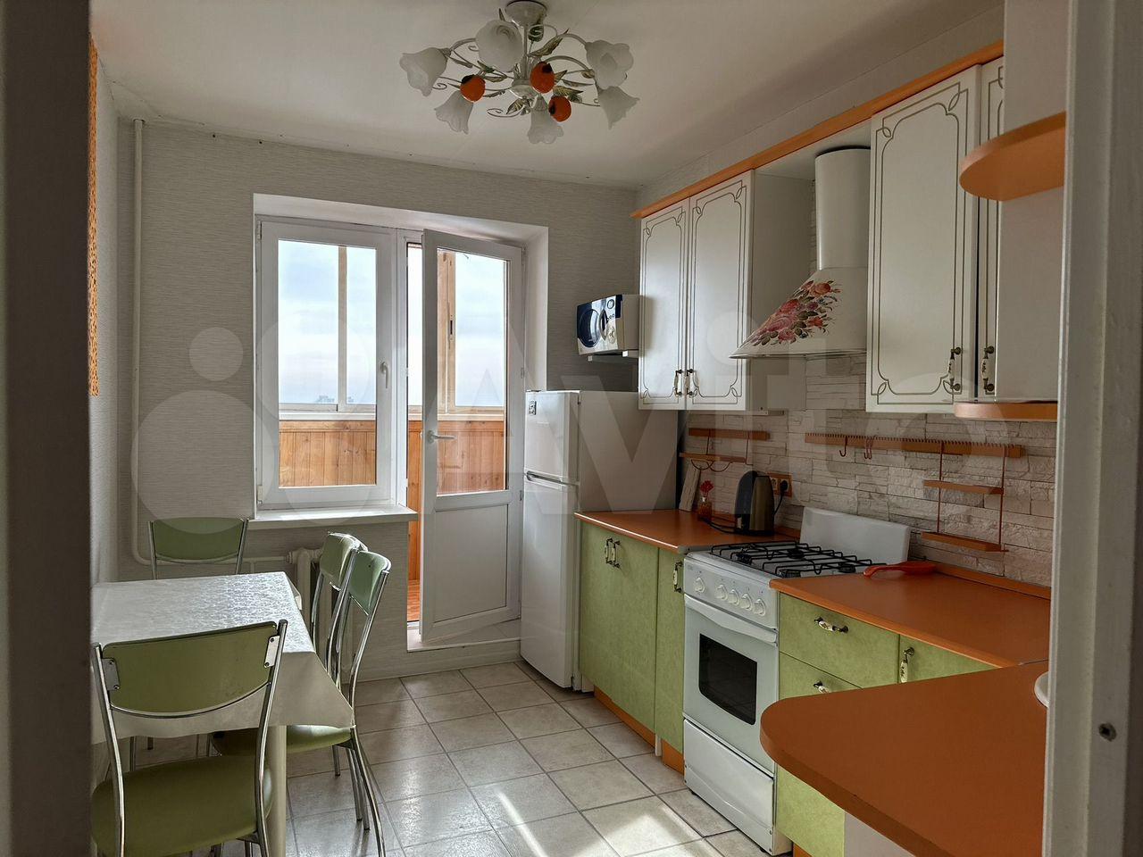 холодильник, микроволновая печь, обеденный стол и стулья, стиральная машинка. Выход на балкон с кухни.