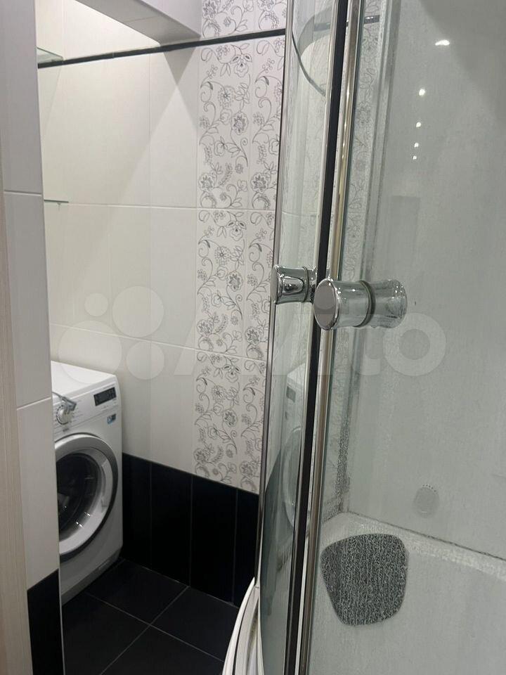 2) санузел: комфортная душевая кабина, стиральная машина, зеркало, полки для хранения, вешалки для одежды и полотенец