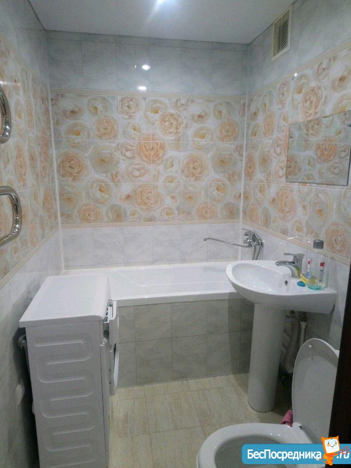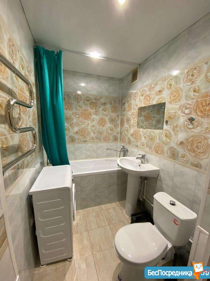 В хорошем состоянии, чистая и уютная. В квартире находится кухня, плита, вытяжка, стол, стулья, диван, холодильник, кондиционер, стиральная машина. Всё что необходимо для житья.