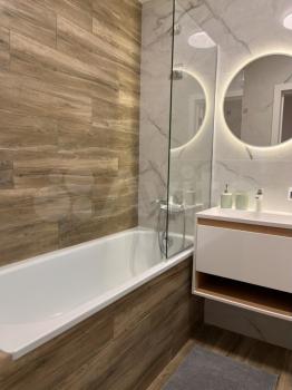 Квартира полностью оснащена. Холодильник, сплит система, стиральная машина, микроволновка, варочная панель, электрический духовой шкаф, диван раскладной, двухместная кровать, шкаф-купе, гардеробная, в ванной тёплый пол.