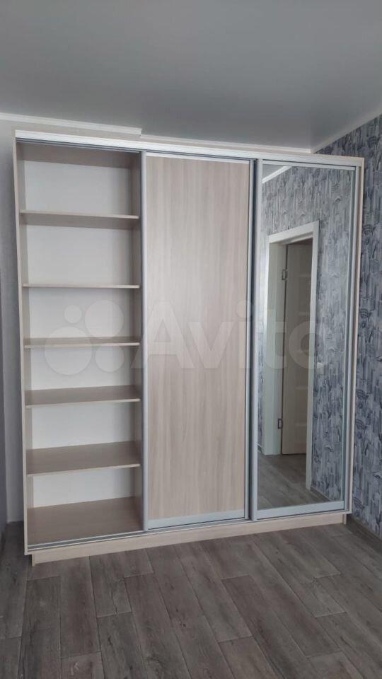 В спальне - двухместная кровать, прикроватная тумбочка, большой шкаф купе.
