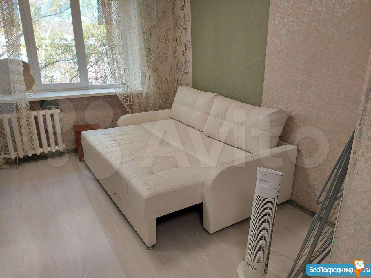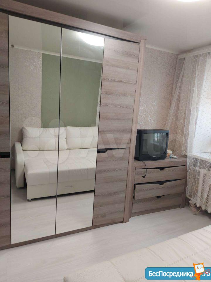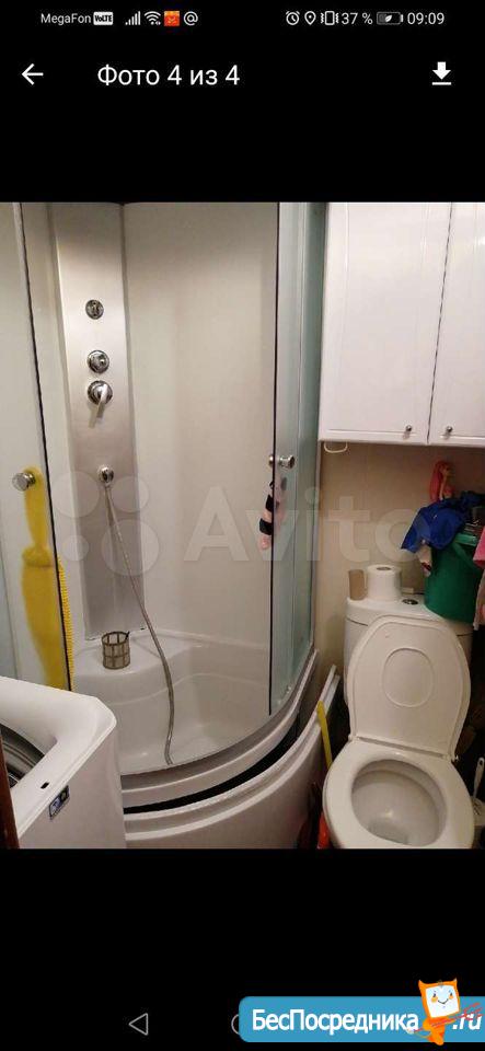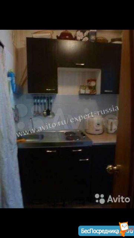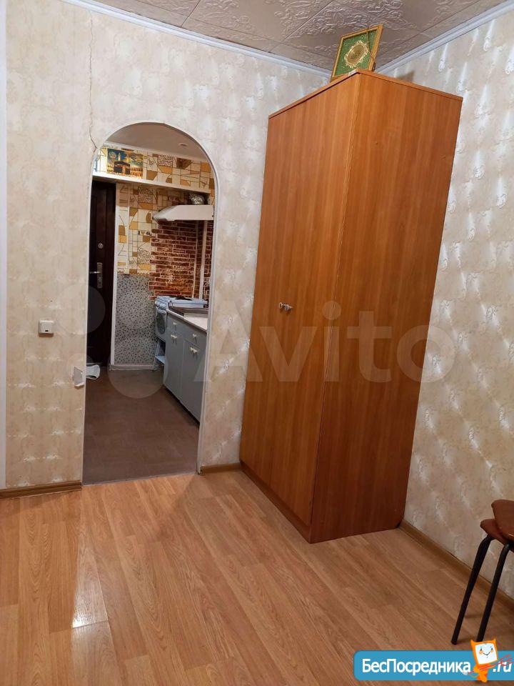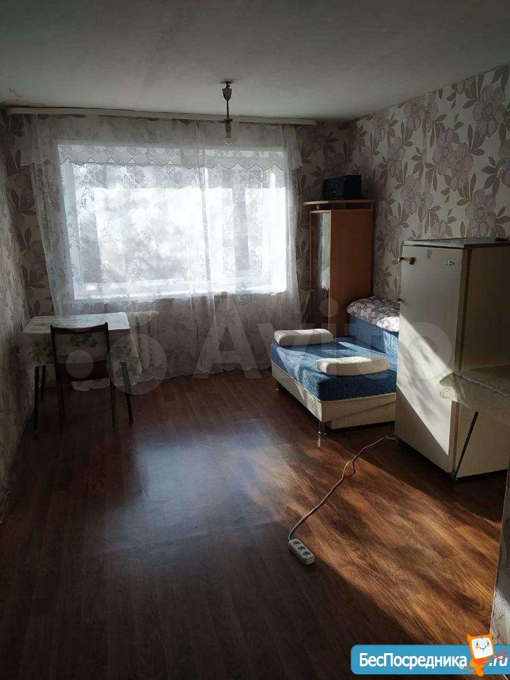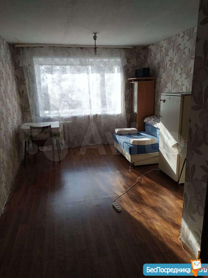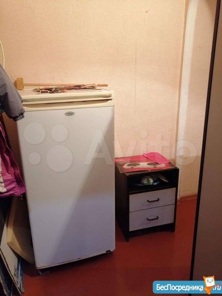 комната в общежитии, в комнате есть диван, шкаф, стол, холодильник, СТИРАЛКИ НЕТ. душ и туалет на 3 комнаты, кухня общая,