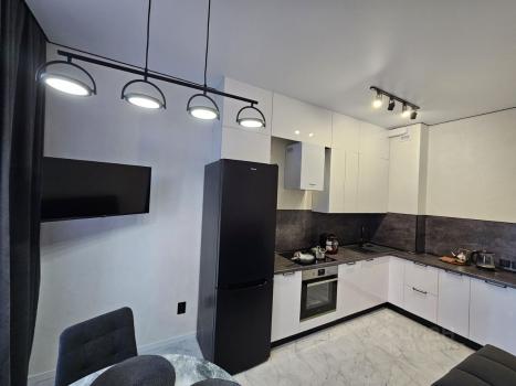 В квартире есть всё необходимое для комфортного проживания: современная мебель на кухне и в комнате, холодильник, телевизор и стиральная машина. Планировка включает в себя совмещённый санузел с душевой кабиной и уютную лоджию для отдыха.