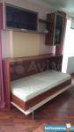 Из мебели есть: диван, встроенная кровать, раскладной стол, встроенный кухонный гарнитур. Множество мест для хранения, включая удобную гардеробную.
