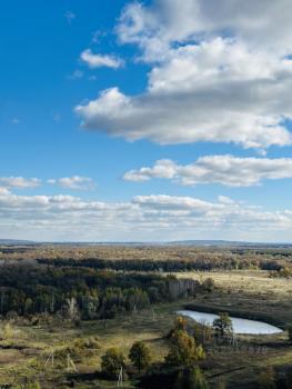 Замечательный вид из окна на лесной массив и озеро.