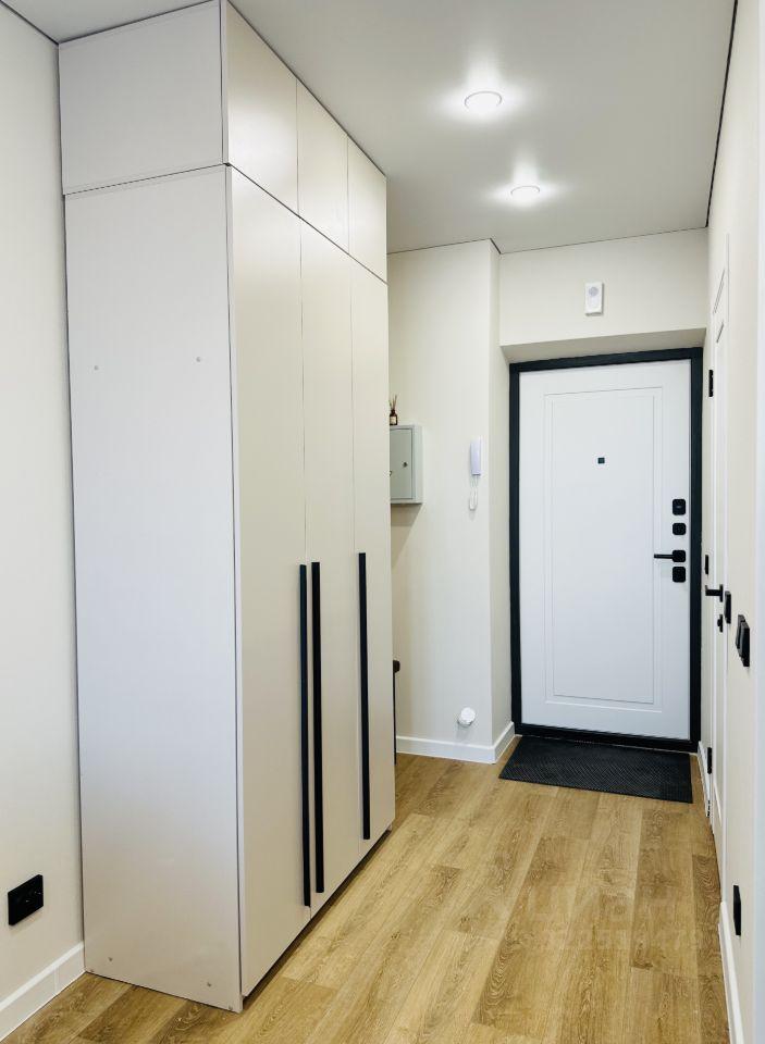 Раскладной диван в гостиной, полноценный кухонный гарнитур с техникой, вместительный шкаф и вешалка для верхней одежды в прихожей, разные сценарии освещения, много розеток.