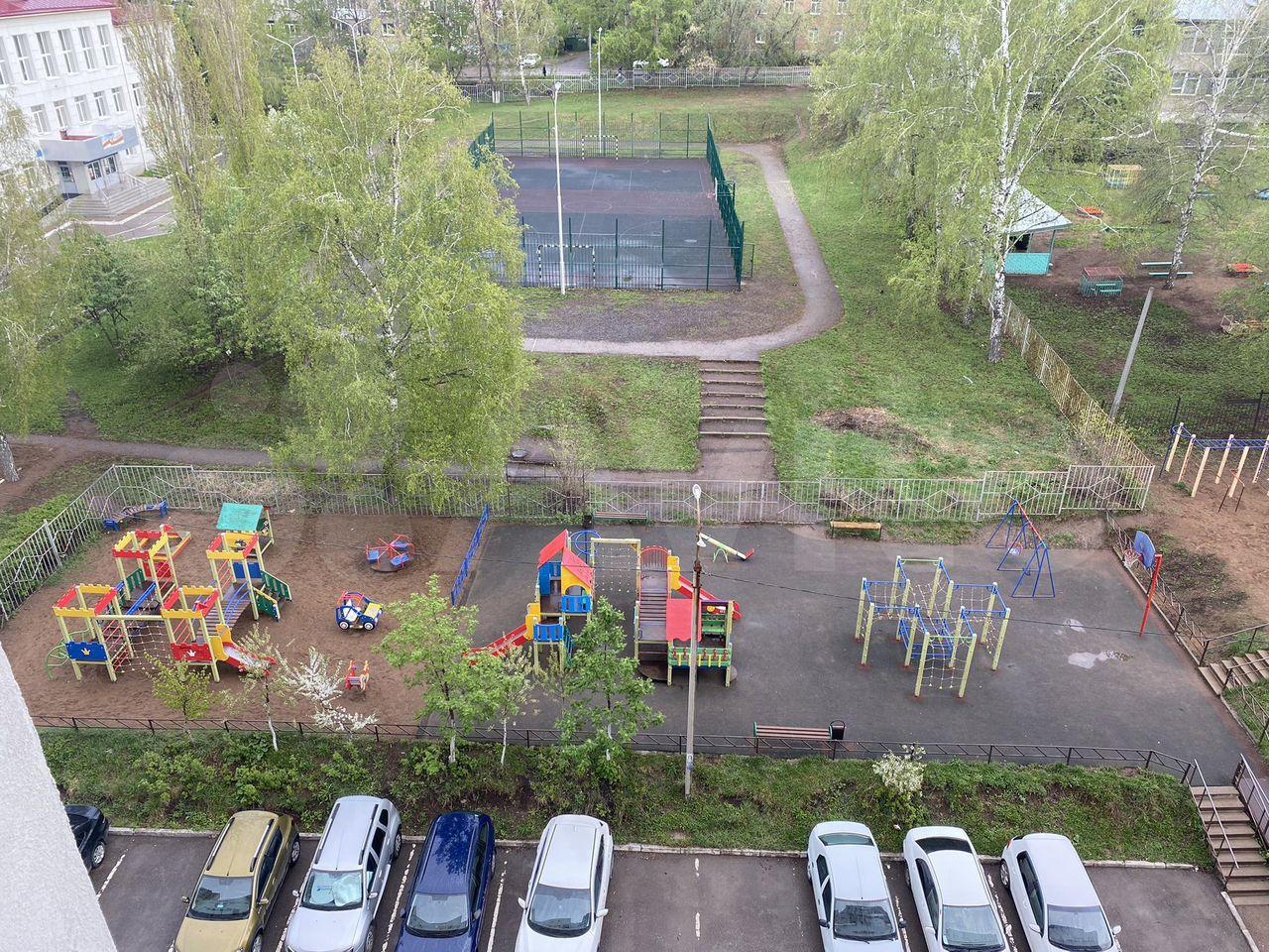 Большая парковка во дворе с шлагбаумом, детская площадка.