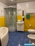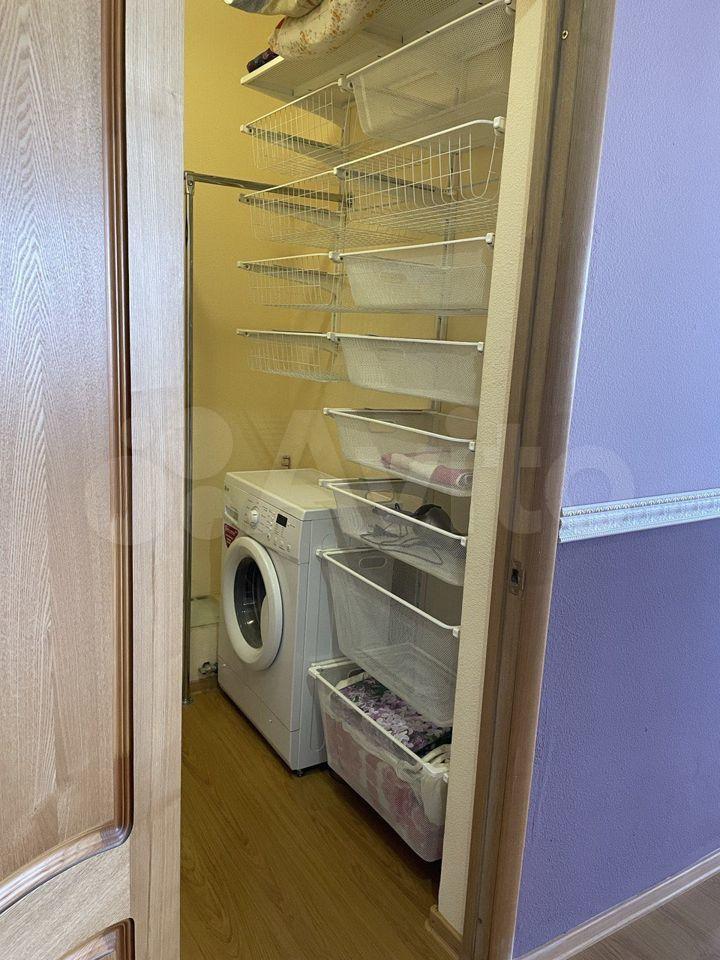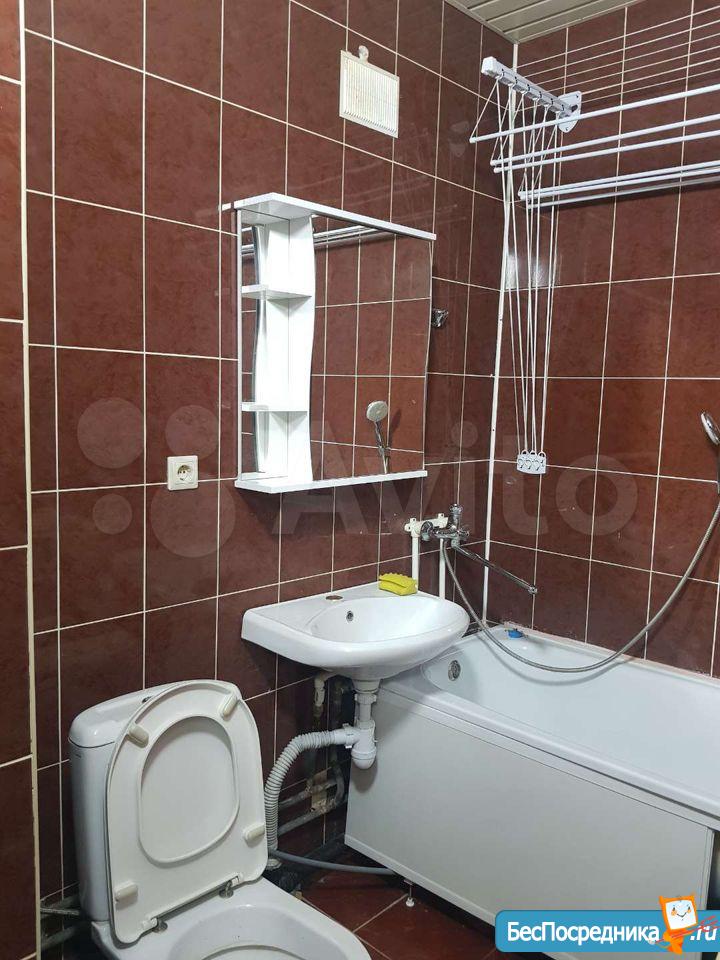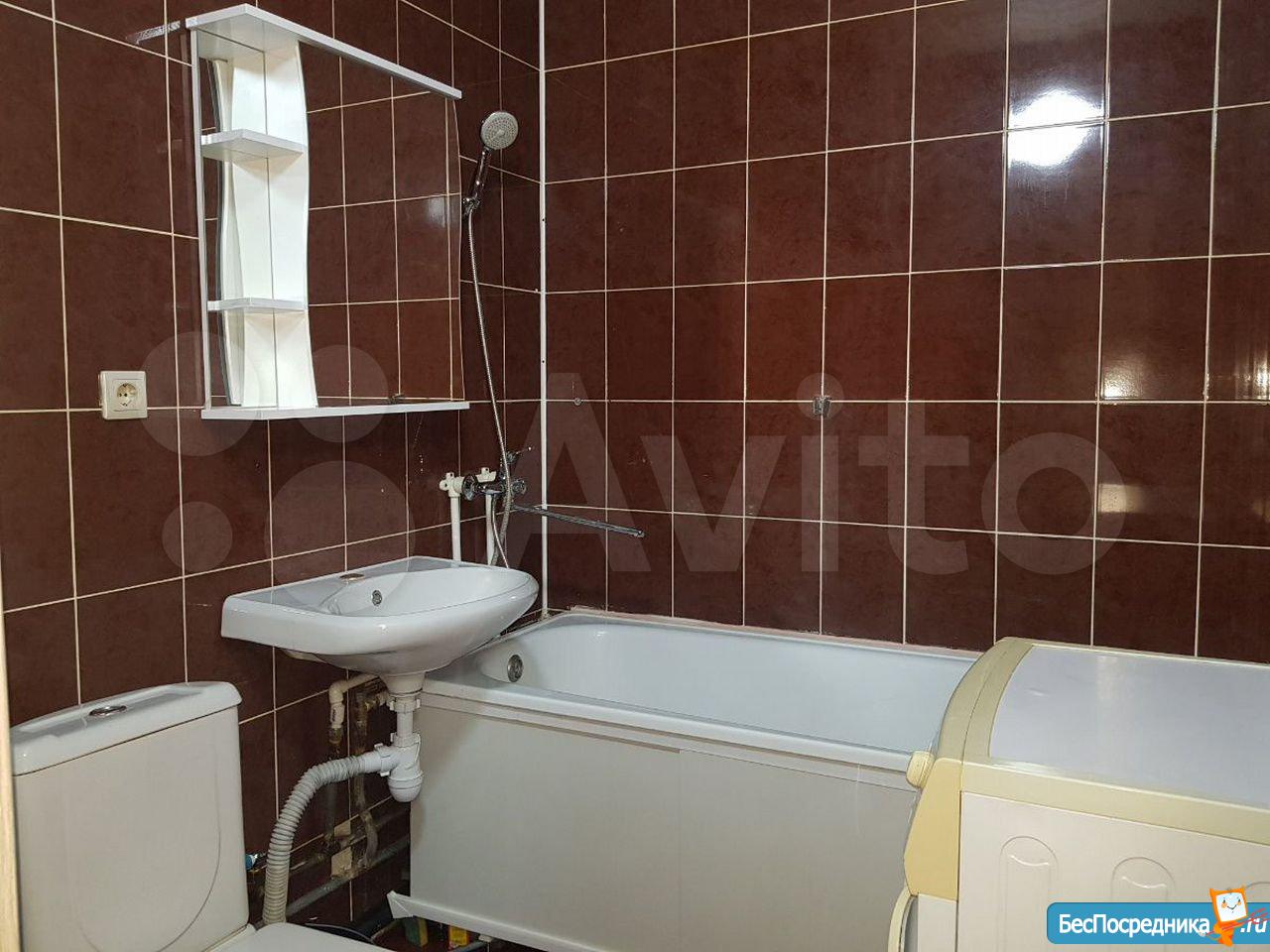 В комнате установлены шкафы и диван, а также имеется телевизор. Из мебели остается шкаф и кровать. Ванная комната оснащена современной сантехникой и стиральной машиной.