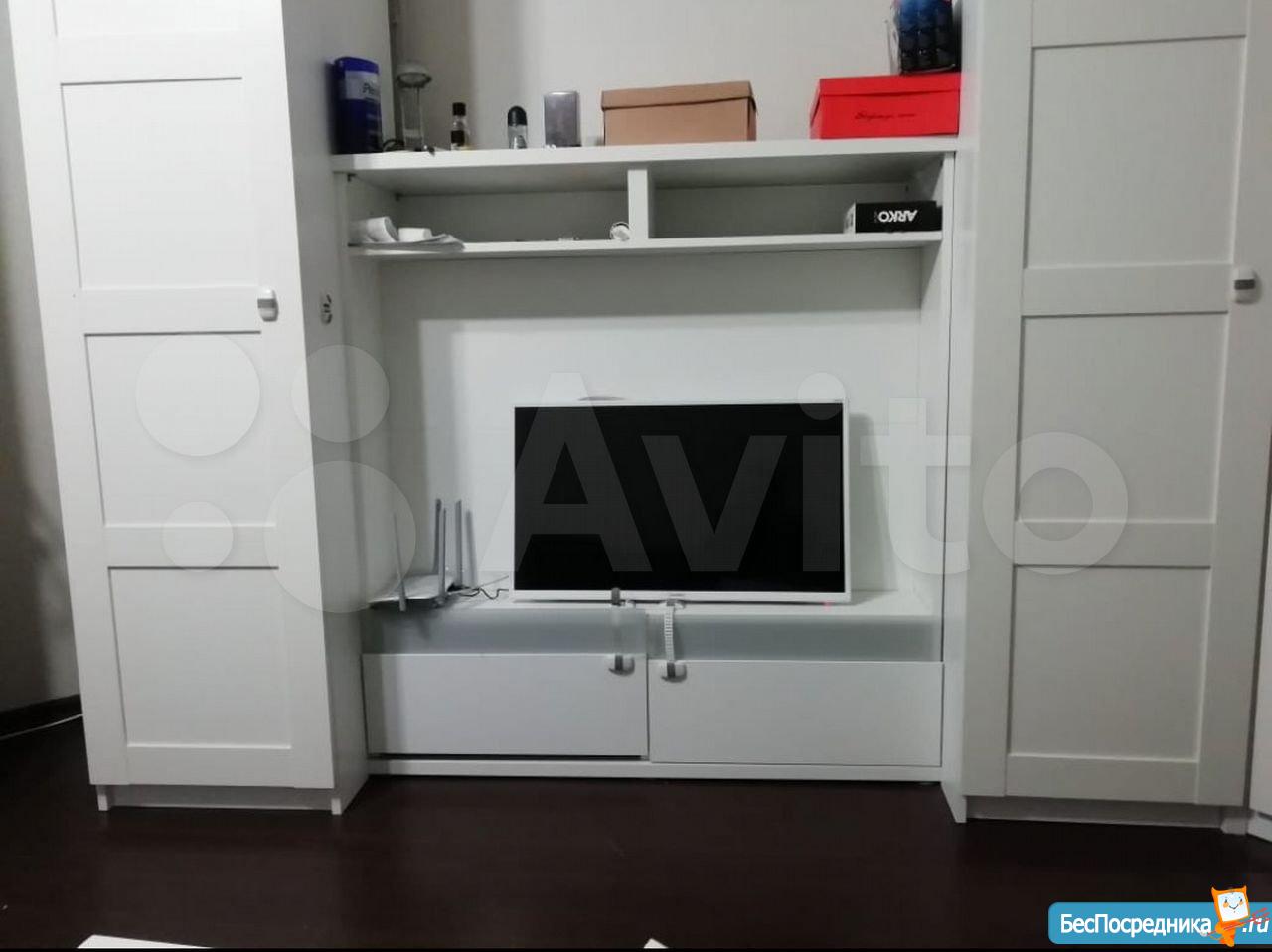 Два фирменных шкафа купе : в прихожей и в комнате. В комнате стоит кушетка, которая раскладывается в полноценную двуспальную кровать( 160*200) с икеевскими матрасами.