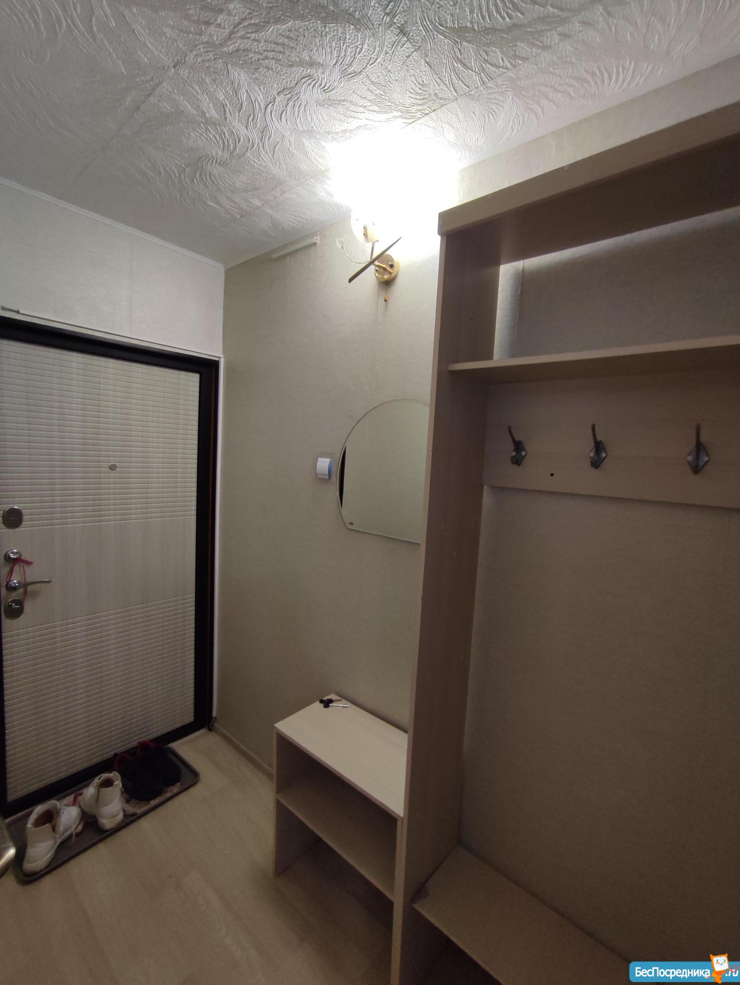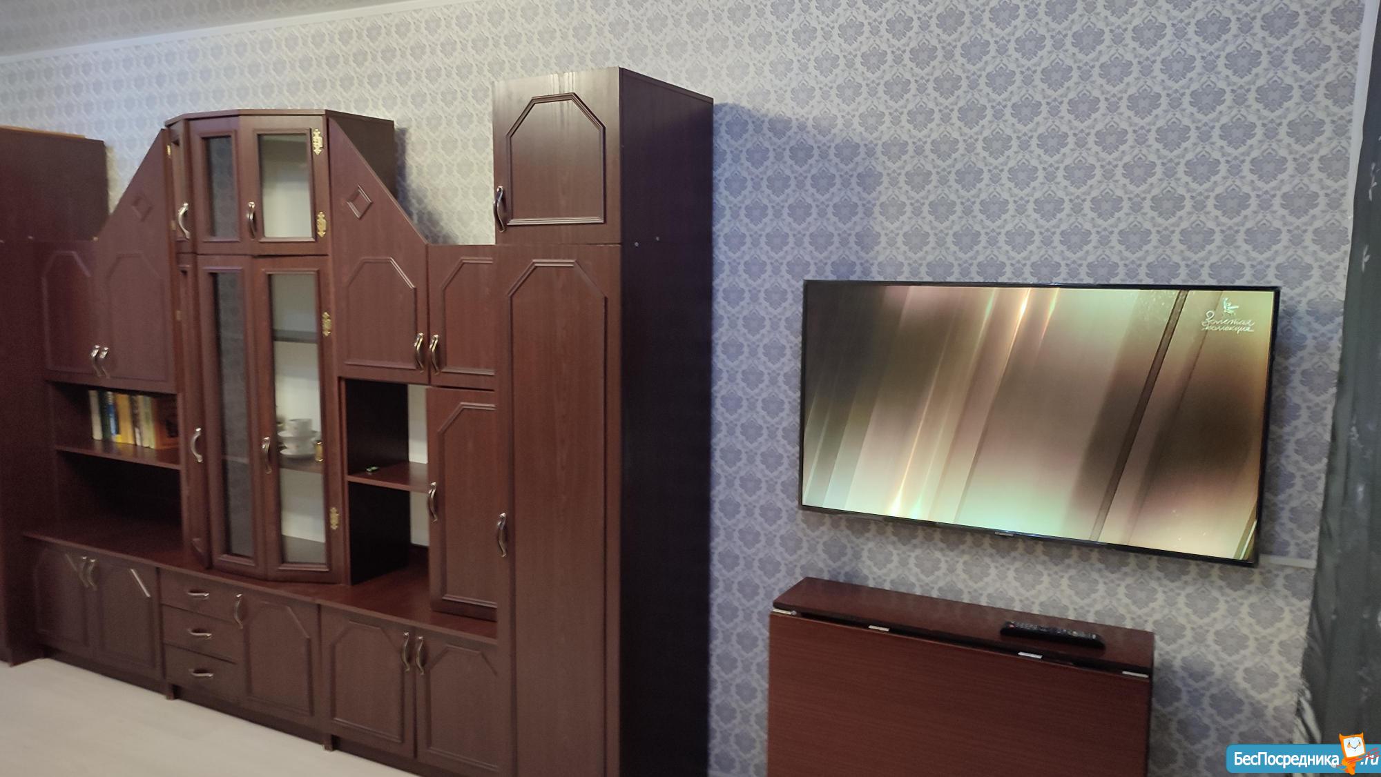 Зал: диван с двумя спальными местами, журнальный столик, шкаф-купе с удобной системой хранения, в том числе и с хозблоком, пылесос, утюг, гладильная доска, Смарт-ТВ с обширной тумбой, балкон.