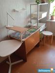 Стиралка, посуда, кастрюли, место в холодильнике , утюг, постельное белье, подушки, одеяла, шкафы, стеллажи, стулья имеются.