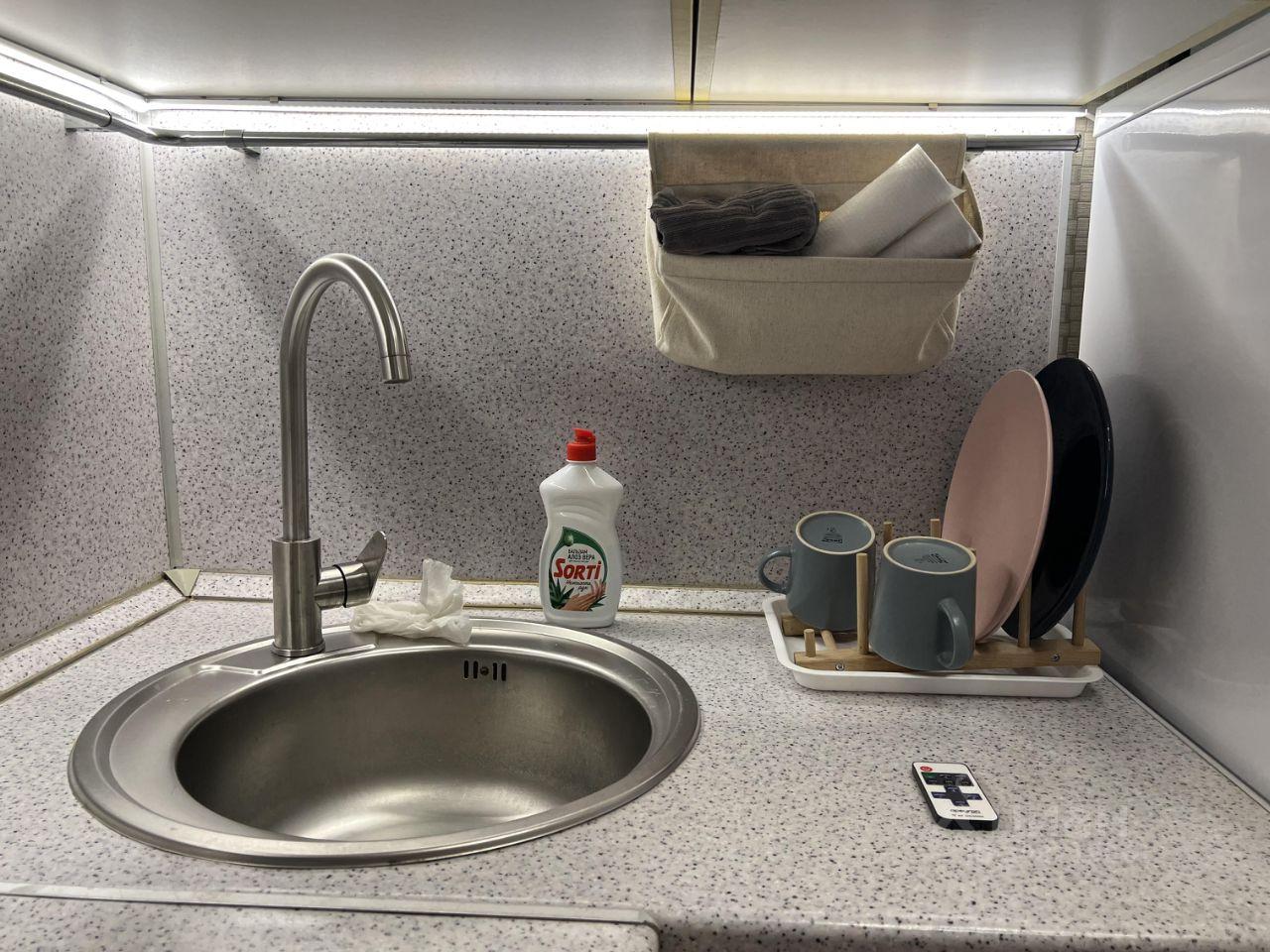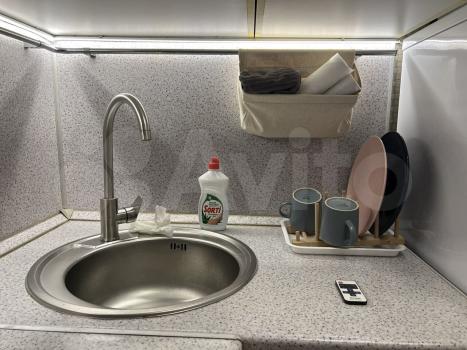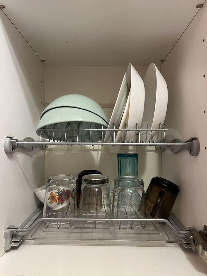 Из техники и мебели есть всё, что нужно для быта - холодильник, микроволновая печь, варочная газовая поверхность, духовка, чайник, стиральная машина, водонагреватель, телевизор с поддержкой интернета, два шкафа, диван, сушилка для белья, утюг, вешалки, стол-книжка для ноутбука или компьютера, кухонная мебель.