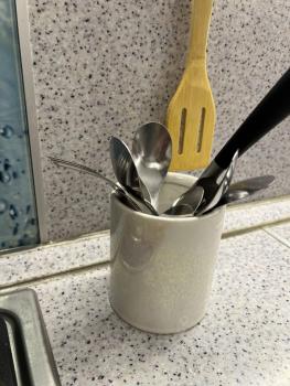 Также есть столовые приборы, тарелки, кружки, сковородки.