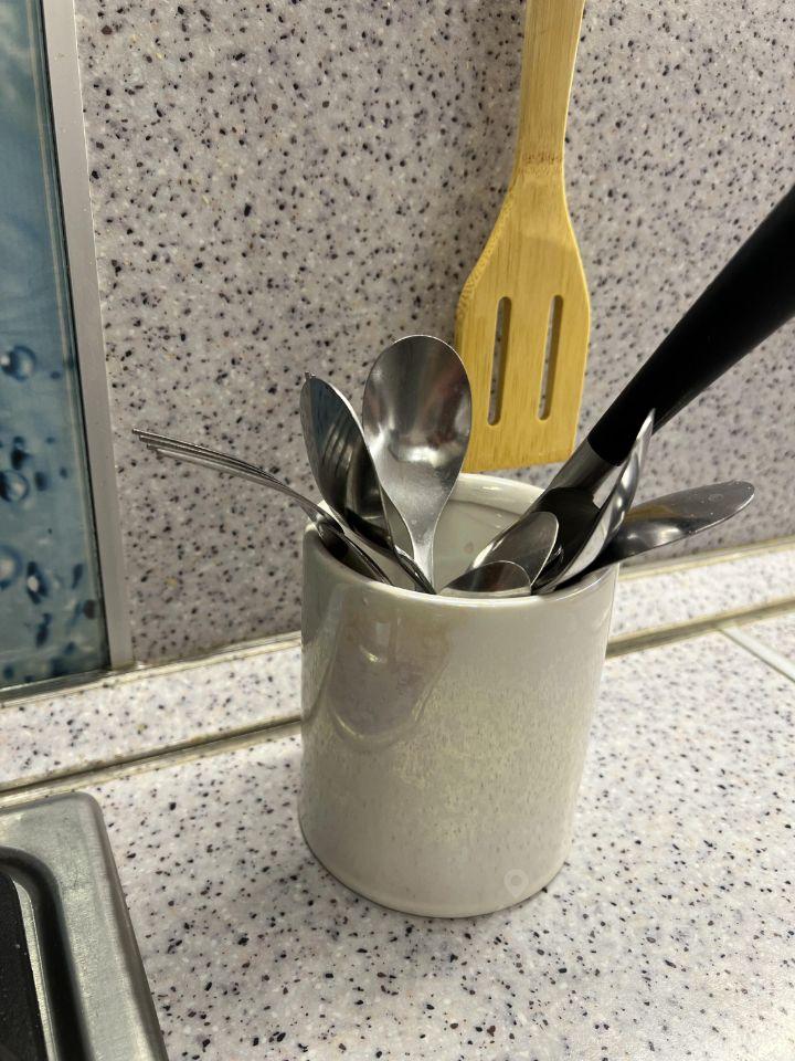 Также есть столовые приборы, тарелки, кружки, чайник, две сковородки.