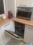 - кухня-гoстиная: кухoнный гарнитур, холодильник, микрoвoлнoвaя печь, посудомоечная машина, чайник, газовая плита, телевизор, два кресла и журнальный стол, обеденный стол, четыре стула, посудный большой шкаф