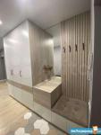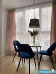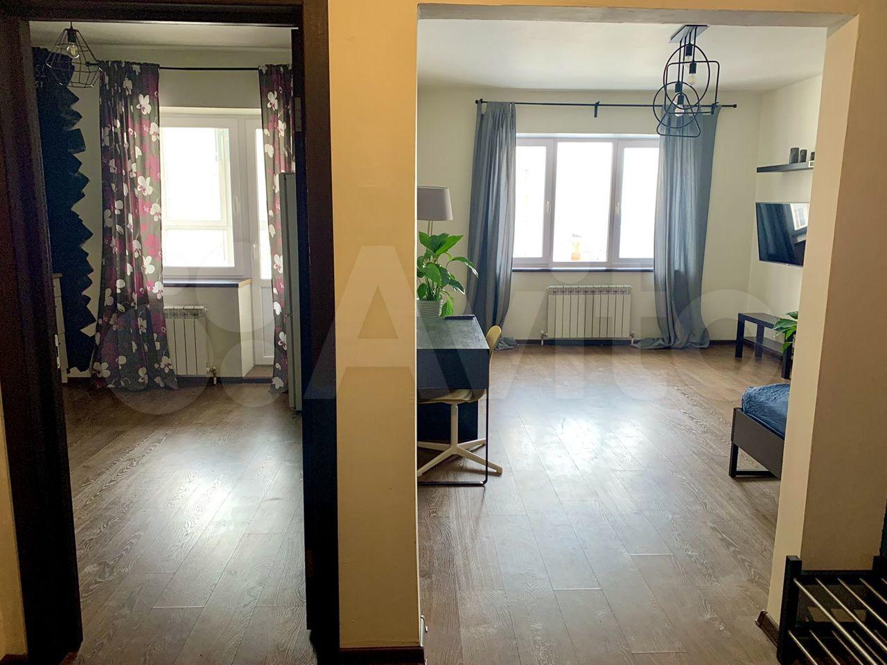 Удачная планировка: большая кухня 12 кв м c выходом на лоджию, просторная комната с гостиной зоной и диванчиком, а так же полноценной двух спальной кроватью и рабочим местом, гардеробная, прихожая, сан узел совмещен. Свежий ремонт, отделка в современном стиле, фартук кухни специальная краска, очень практична, можно писать мелом.