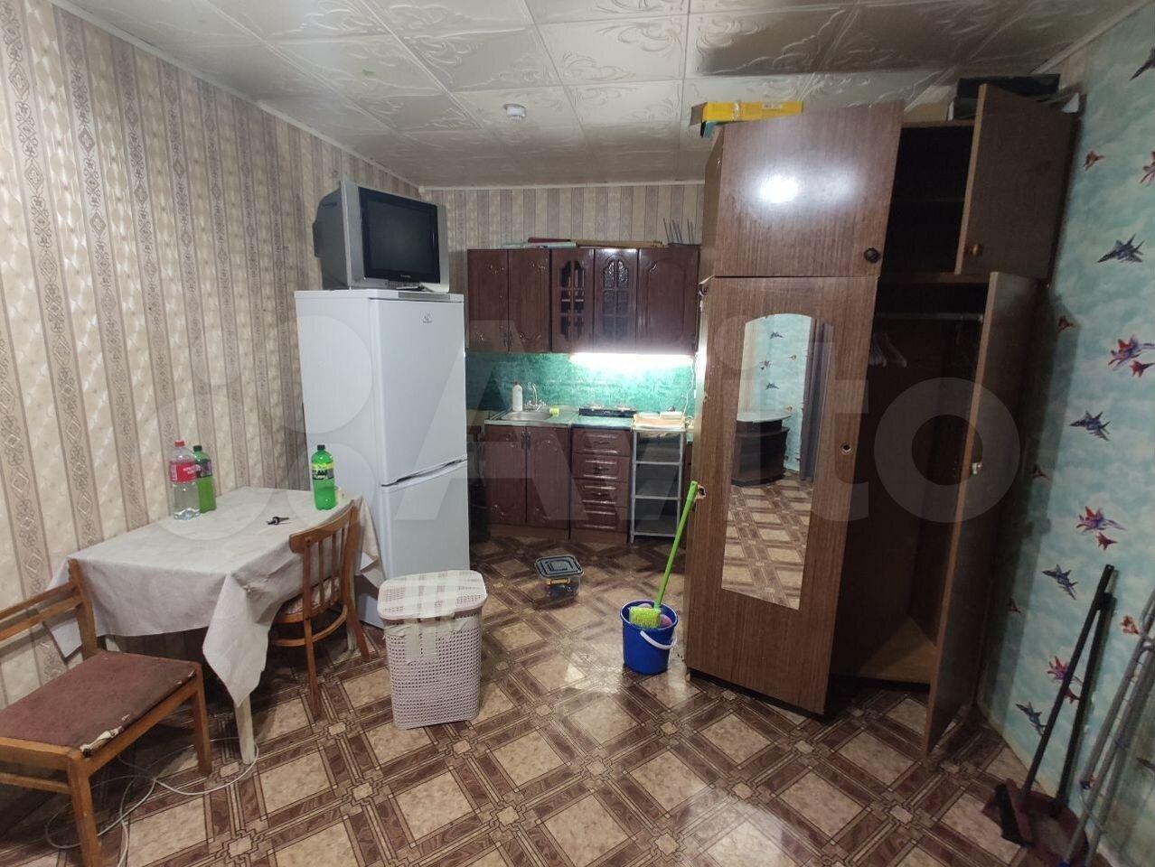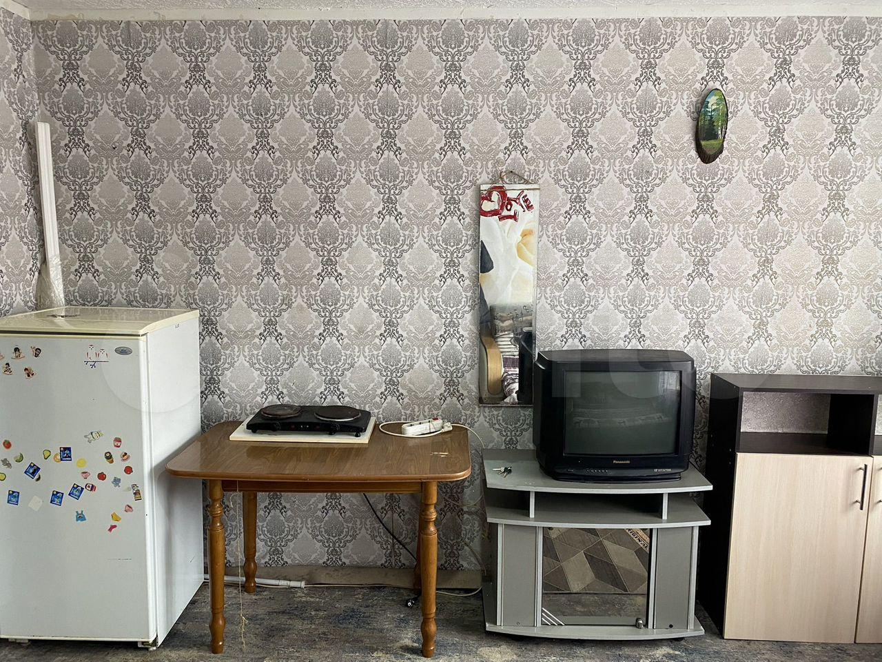 В комнате: угловой шкаф, тумба, диван, тумба под ТВ, холодильник, стиральная машина, телевизор плазменный, гладильная доска, стол, комод.Мебель в хорошем состоянии. В комнату проведена вода.