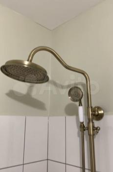Огромная ванная, тропический душ, сантехника и фурнитура под бронзу.