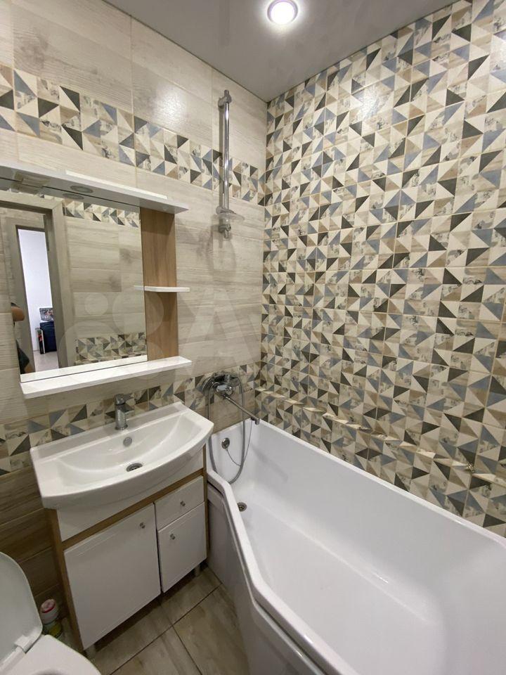 Санузел совмещённый, оформлен в светлых тонах и оборудован ванной. Из комнаты есть выход на застеклённую лоджию.