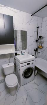 Ванная комната совмещенная, тоже просторная и красивая, с подогреваемым полом. Есть стиральная машина, ванна, гигиенический душ, сам туалет.