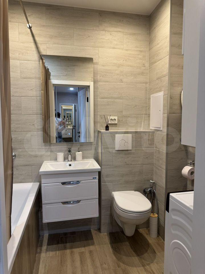 Санузел совмещенный, выполнен в современном стиле, оборудован ванной и стиральной машиной. В прихожей предусмотрены шкафы и обувница для хранения вещей, есть также гардеробная для удобного размещения одежды.
