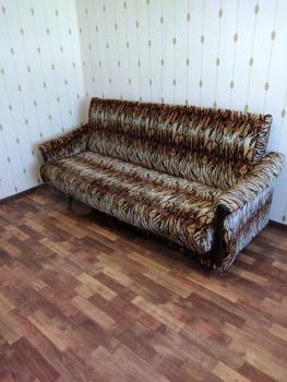 Сделан ремонт. В комнате холодильник, диван, шкаф для одежды и другая мебель.