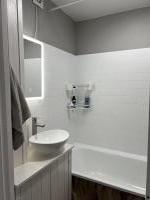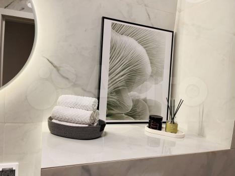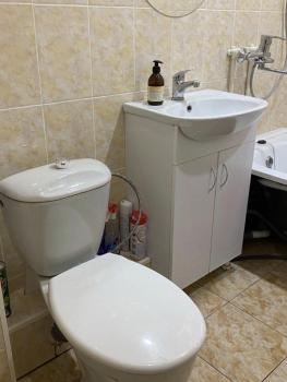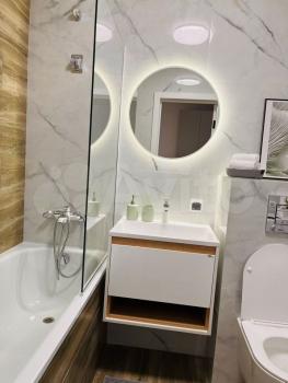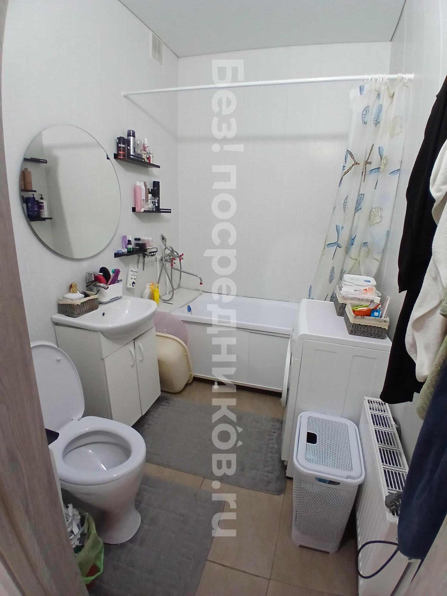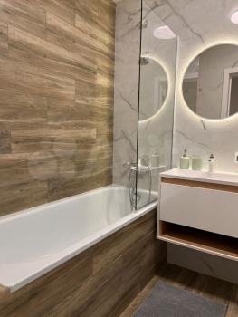 Ванная комната совмещенная, оформлена в современном стиле с качественной плиткой. Из мебели предусмотрены вместительные шкафы для хранения вещей. Лоджия застекленная, что позволяет наслаждаться видом из окна.