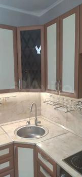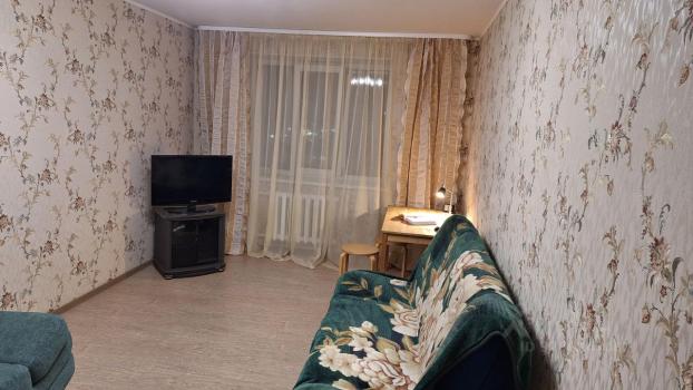 В гостинoй уcтaновлен удобный диван и вместительный шкаф, а также имеется выход на застеклённую лоджию. Кухня оборудована всей необходимой техникой: холодильник, плита и микроволновая печь. Также есть обеденный стол и стулья.