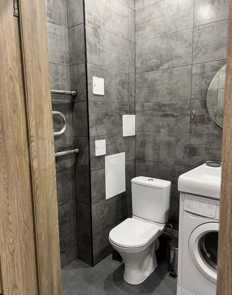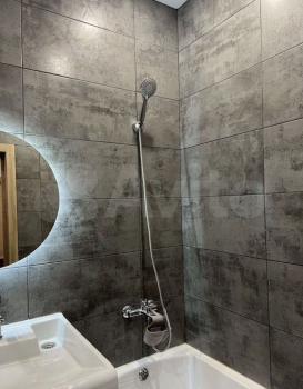 Санузел совмещённый, оформлен в современном стиле с качественной плиткой. Установлена стиральная машина.