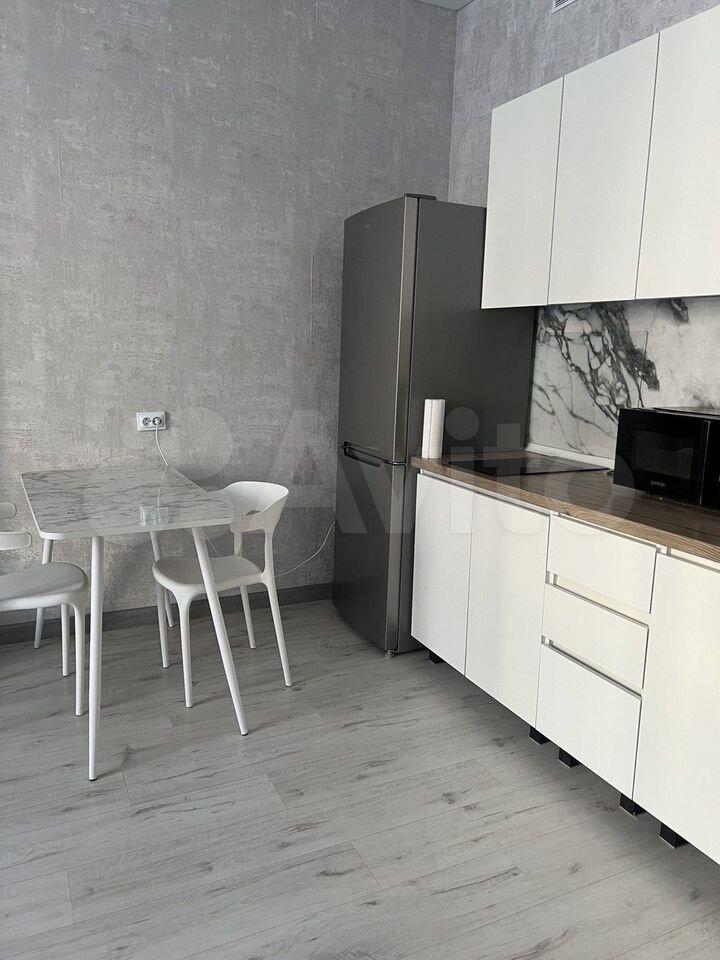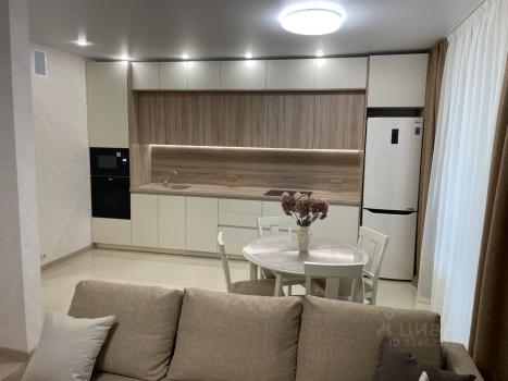 Кухня просторная, оснащена современной мебелью и техникой. В гостиной установлен удобный диван и телевизор. В спальне — большая кровать и вместительная гардеробная.