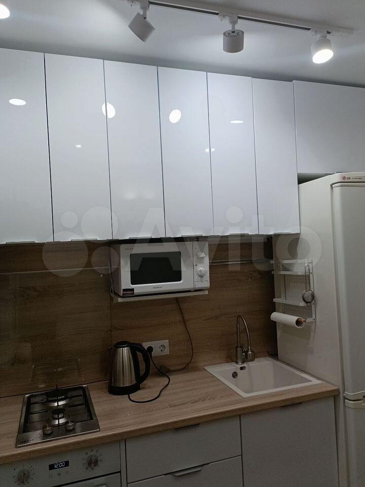 Кухня: варочная панель, духовой шкаф, холодильник, микроволновка и чайник