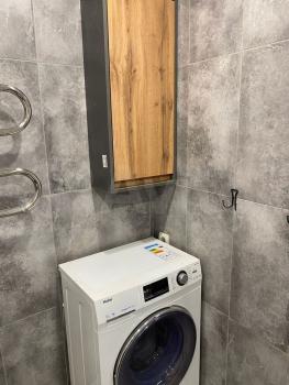 Просторный совмещенный сан. узел отделан кафельной плиткой, имеется стиральная машинка автомат, навесной шкаф с полкой и тумба под раковину. На случай отключения горячей воды установлен водонагреватель.