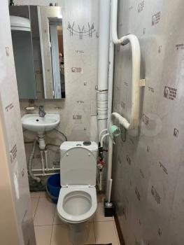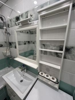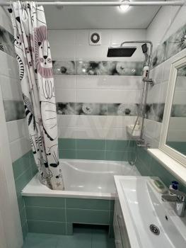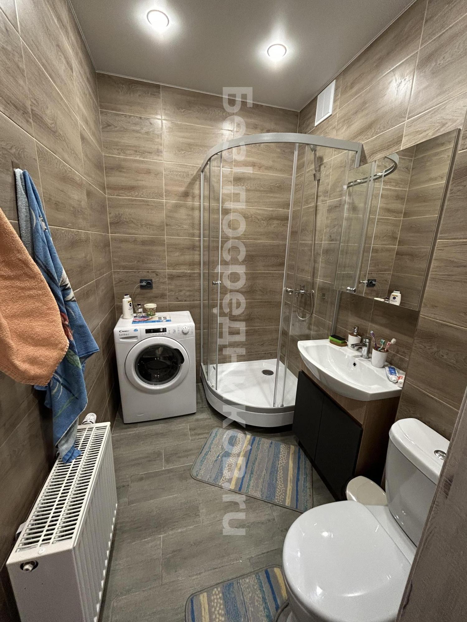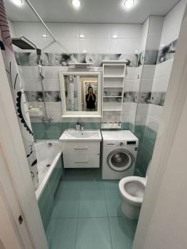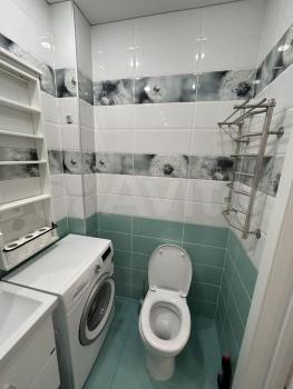 Ванная комната совмещенная, оснащена стиральной машиной и современной сантехникой. Окна выходят на городские пейзажи, обеспечивая много естественного света. В квартире установлен кондиционер для комфортного проживания в любое время года.