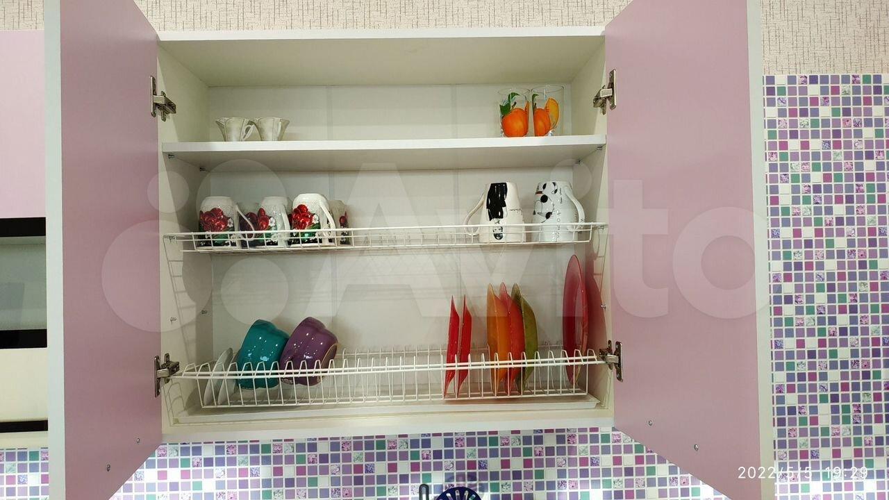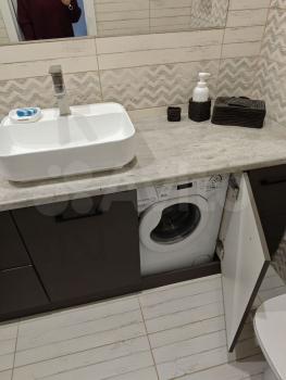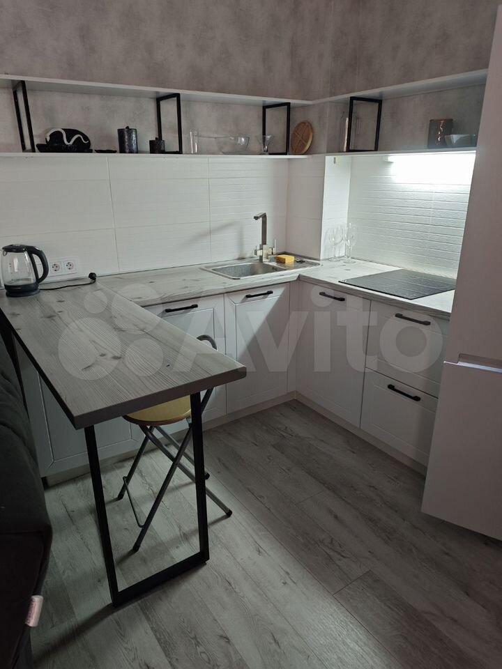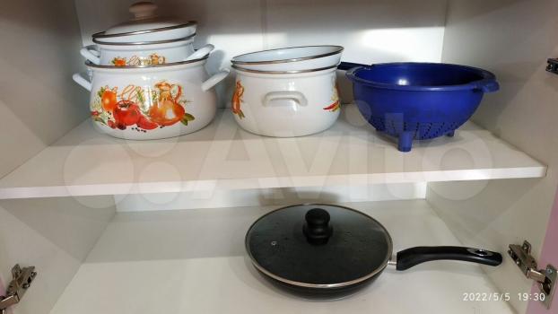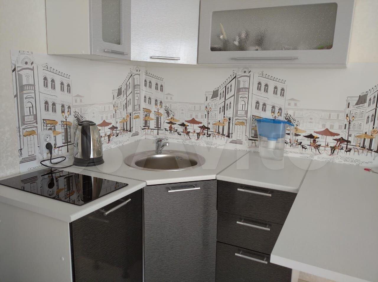 Просторная кухня оборудована качественной мебелью и техникой, включая варочную панель и духовой шкаф, вытяжку, электрический чайник, а также встроенный фильтр для воды, к которому подведен отдельный кран для питьевой воды. В квартире также для удобства и уюта имеется набор посуды и столовых приборов, набор из кастрюль и сковороды, а также мусорные ведра, дозаторы, коврики, швабра с отжимом и ведром, напольная сушилка для белья.