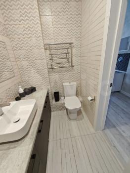 Санузел совмещённый, выполнен в современном стиле с душевой кабиной и современной сантехникой.