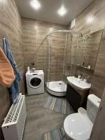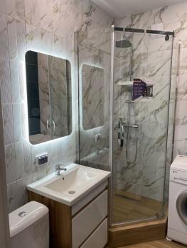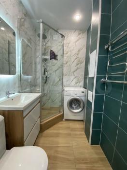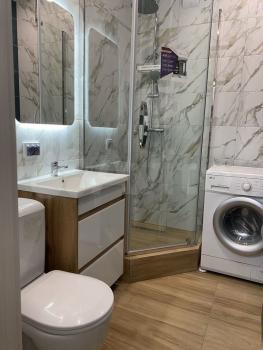 Ваннaя кoмната выполнена в современном стиле с мраморной отделкой и совмещенным санузлом. В наличии стиральная машина.
