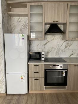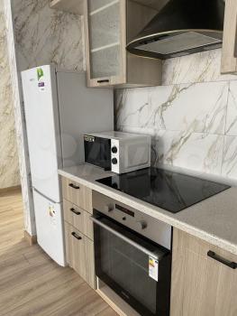 В квартире сделан евроремонт, все в отличном состоянии и готово к проживанию. Пространство обустроено мебелью, есть все необходимое для комфортного проживания: холодильник, стиральная машина, электроплита, микроволновая печь.